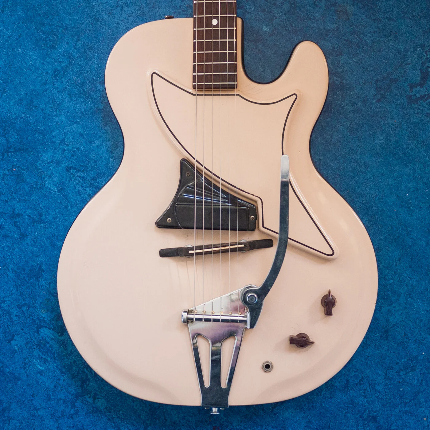 In the 1960s, the Valco company tried its hand at making guitars out of fiberglas. Except the name “fiberglas” was patented. So, they opted for the more fanciful “Res-O-Glas” moniker to describe this newfangled way of constructing a modern instrument. The results were pretty good, and to this day, hipsters the world over covet these singular guitars. The great thing about Res-O-Glas, like its cousin Fiberglas, was its ability to be molded to any shape, and take on any color. And so it was that Valco produced reds, yellows, blues and whites. And….skin?